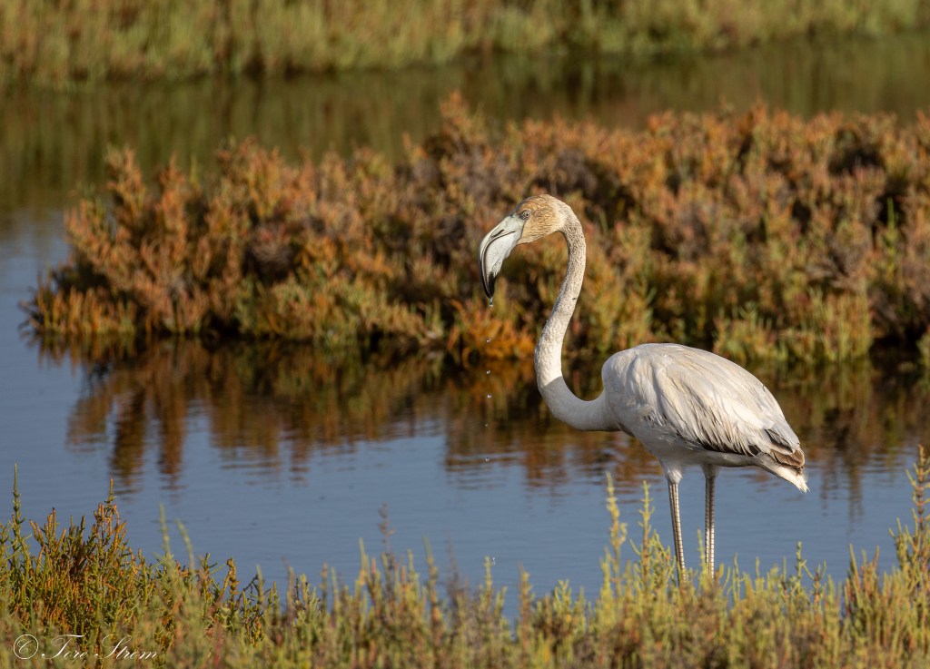 Tore fant en flamingo som hadde tid til et par bilder, dette er nok en ungfugl ettersom den foreløpig mangler den rosa drakten.. De blir rosa av maten de spiser. Bestanden i Sør-Spania er på rundt 6000 fugler.