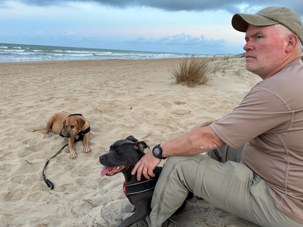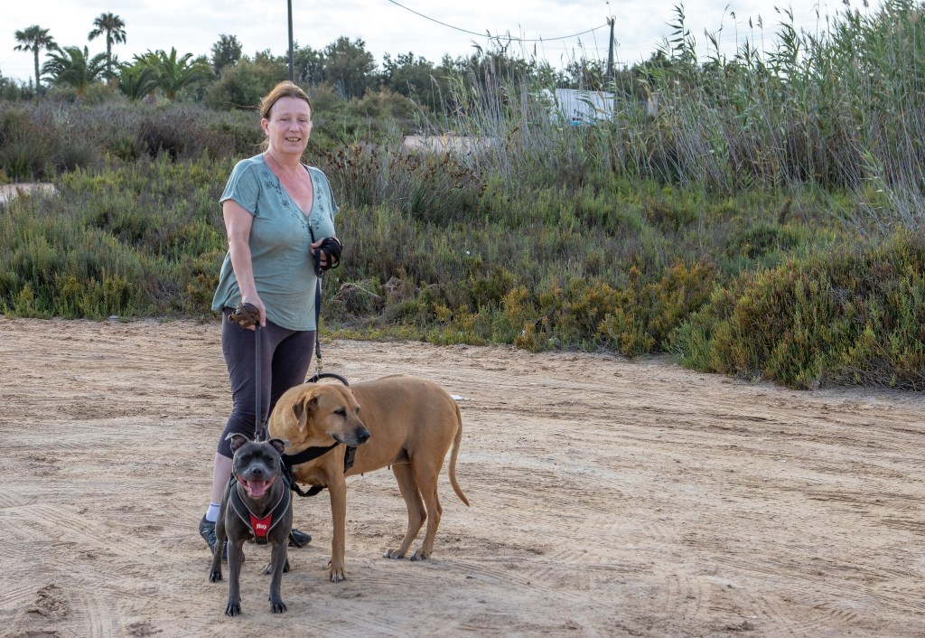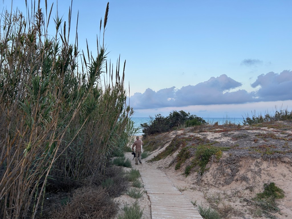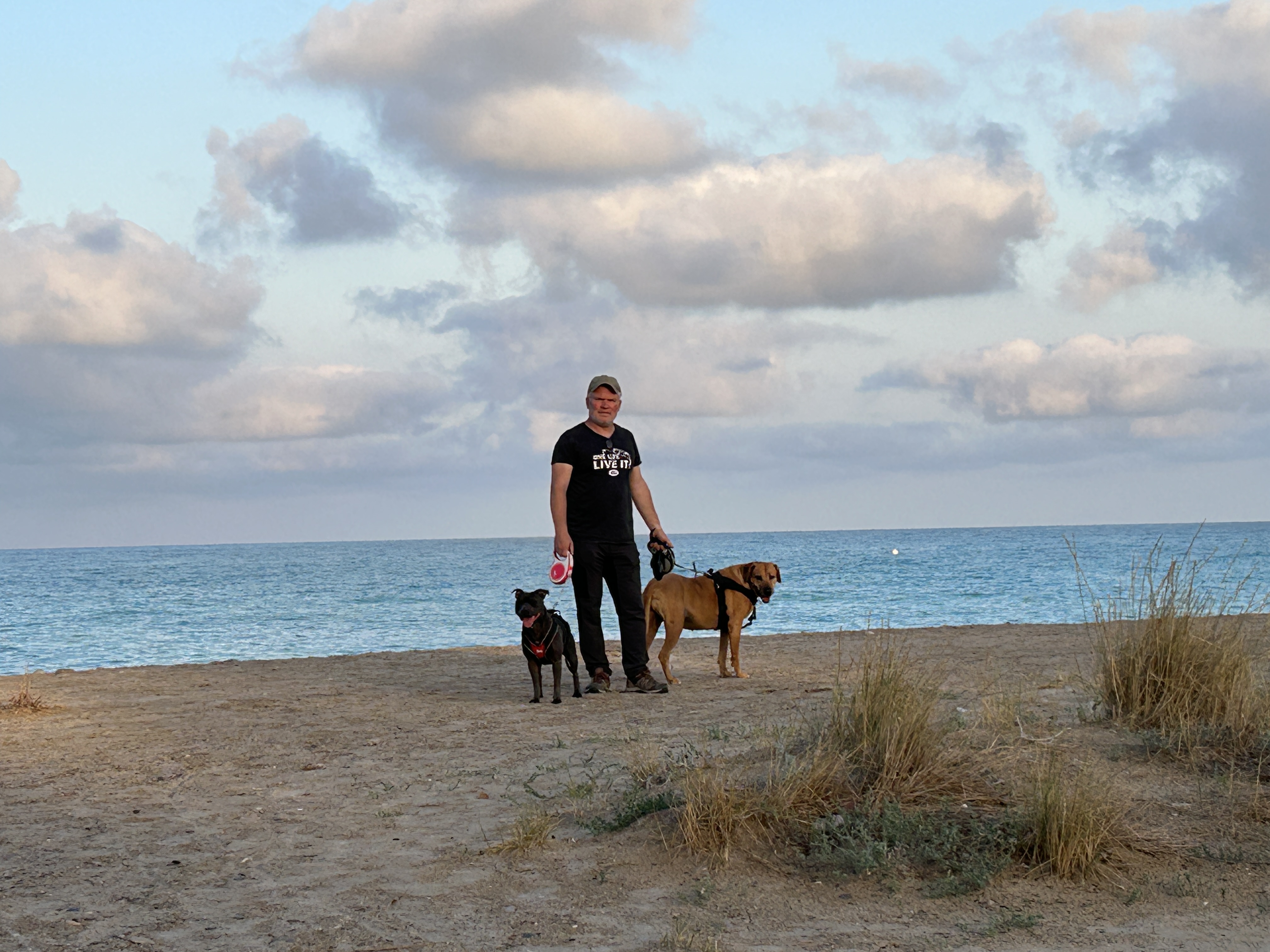 Det var blitt tidlig kveld og mer behagelig temperatur. Så det var på tide å sette kursen mot et annet reisemål på vår bucketlist – de rosa saltsjøene i Torrevieja. Men, nå er det jo slik at de noen dager kan være spektakulært rosa, mens de andre dager ikke har et snev av rose nyanse i det hele tatt. Så, her gjelder det å ha kontakter, og i dette tilfellet, så hadde Tore en kollega som har hytte nettopp der, i nærheten av saltsjøen, og han hadde en sønn som tilfeldigvis var der. Han ga tommel opp… saltsjøen er fin og rosa. Så da dro vi dit for en kveldstur med hundene og foto-session selvfølgelig. (Jeg tok meg av det første og Tore det siste).