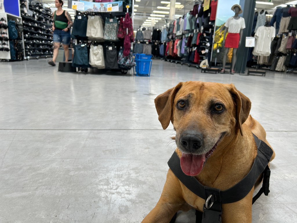 Så var det vår tur og på vår favorittbutikk Dechlaton, som selger sport- og fritidsutstyr. Jeg hadde oppdaget at jeg kanskje hadde pakket litt for lite t-skjorter og sokker. Også her er hunder velkommen.