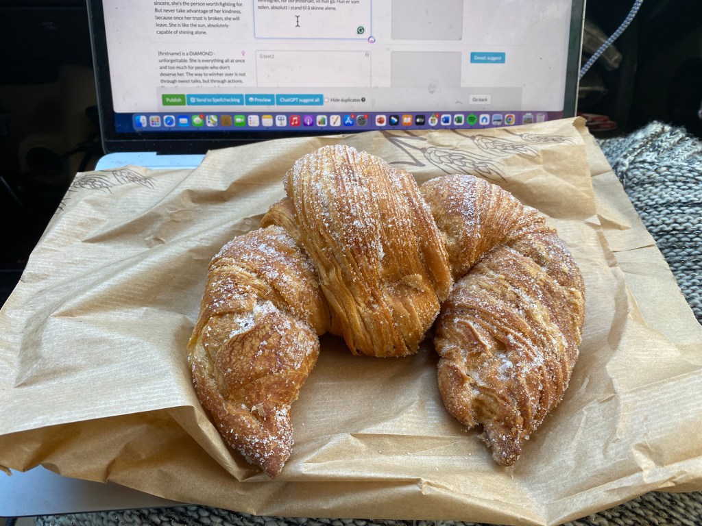 Men først en matbit. Det blir ofte croissanter til frokost. Og, her hadde Tore funnet en som var ekstra stor, og til og med sukker på. Den dekket bokstavelig talt hele tastaturet mitt. Og ja, en var mer enn nok til oss begge.