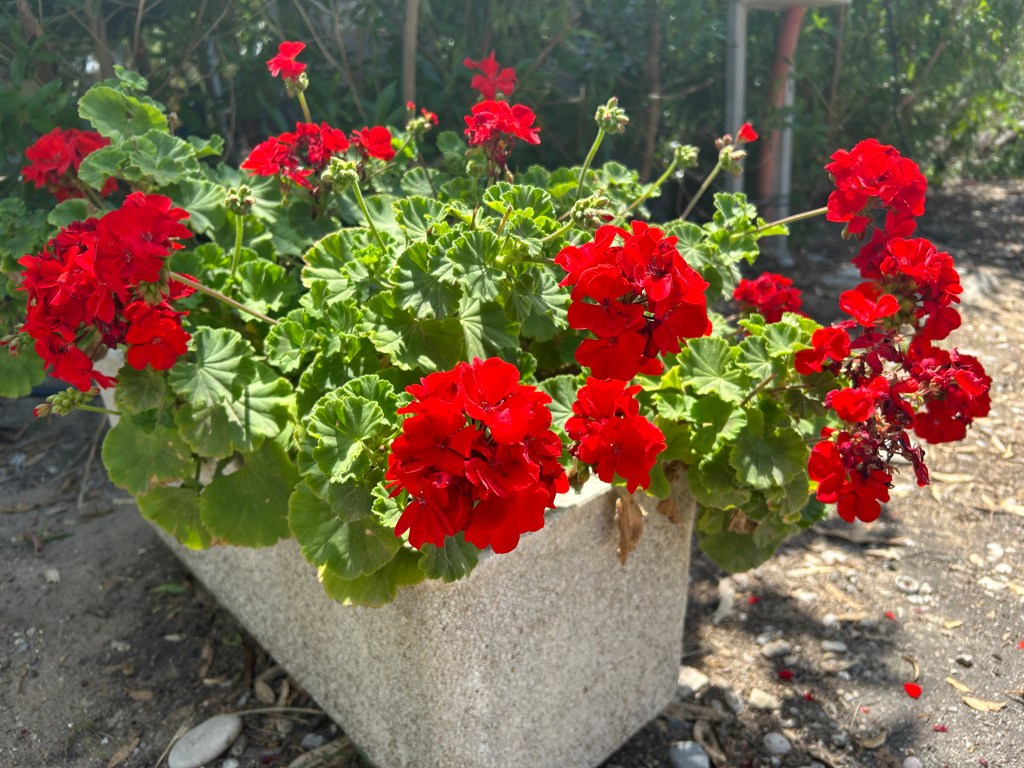 Ett bilde av balkongkassene med perlagonium må jo med… og takk til alle de som sendte oss humoristiske kommentarer med spørsmål om disse var medbragt. Nei, det var de ikke, men jeg har faktisk sett de som reiser med sine egne blomster. Potteplanter på tur, ja, så slipper du å finne noen som vil vanne dem mens du er borte.