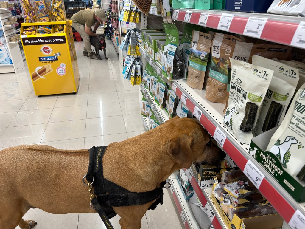 Først til Kiwoko, vår faste dyrebutikk i Spania. Her får de alltid lov til å bli med inn og snike i hyllene. Det er alltid noen gode tilbud, og de har alltid satt frem skåler med både mat og vann, selv om våre hunder aldri vil røre det.