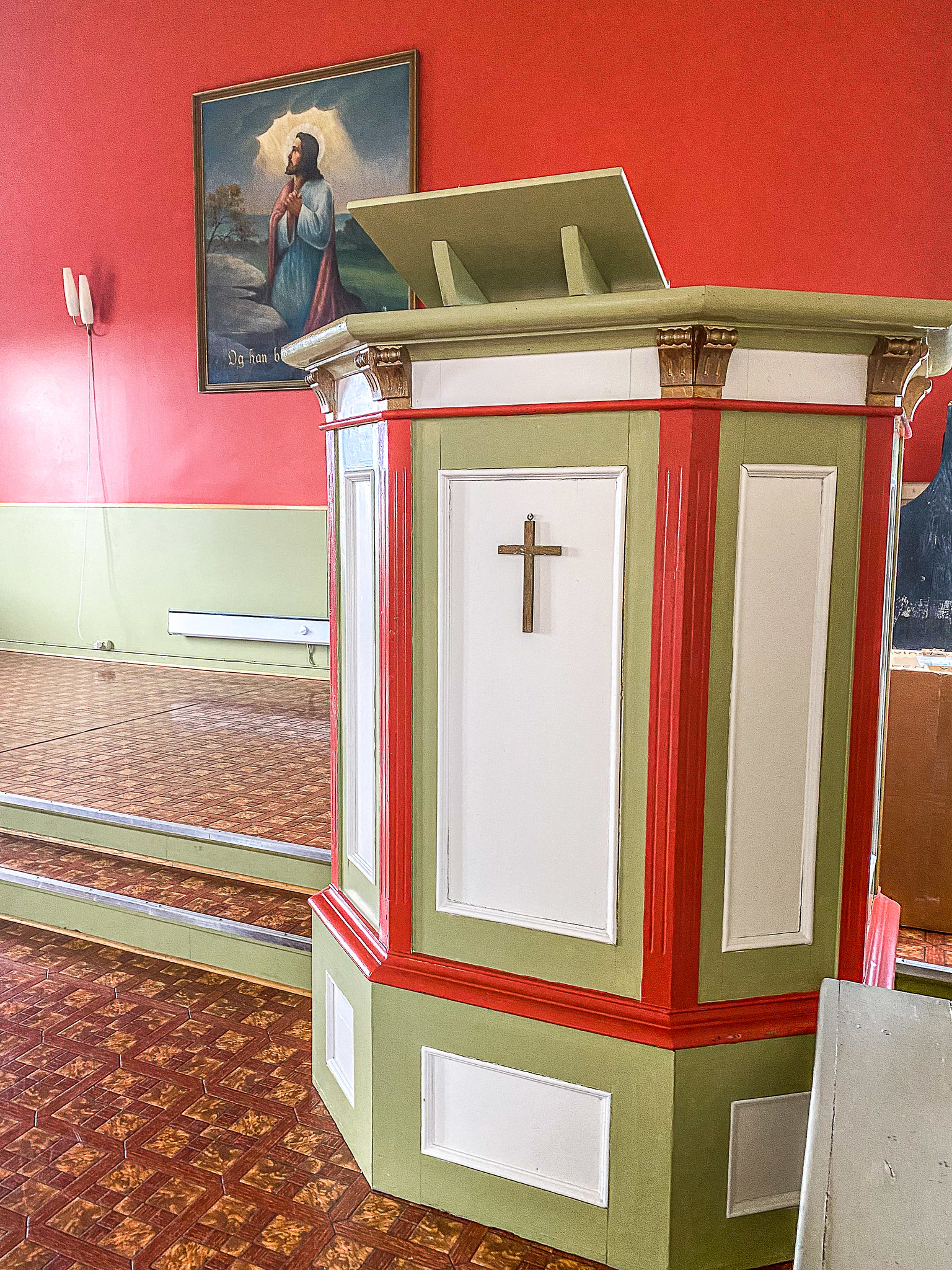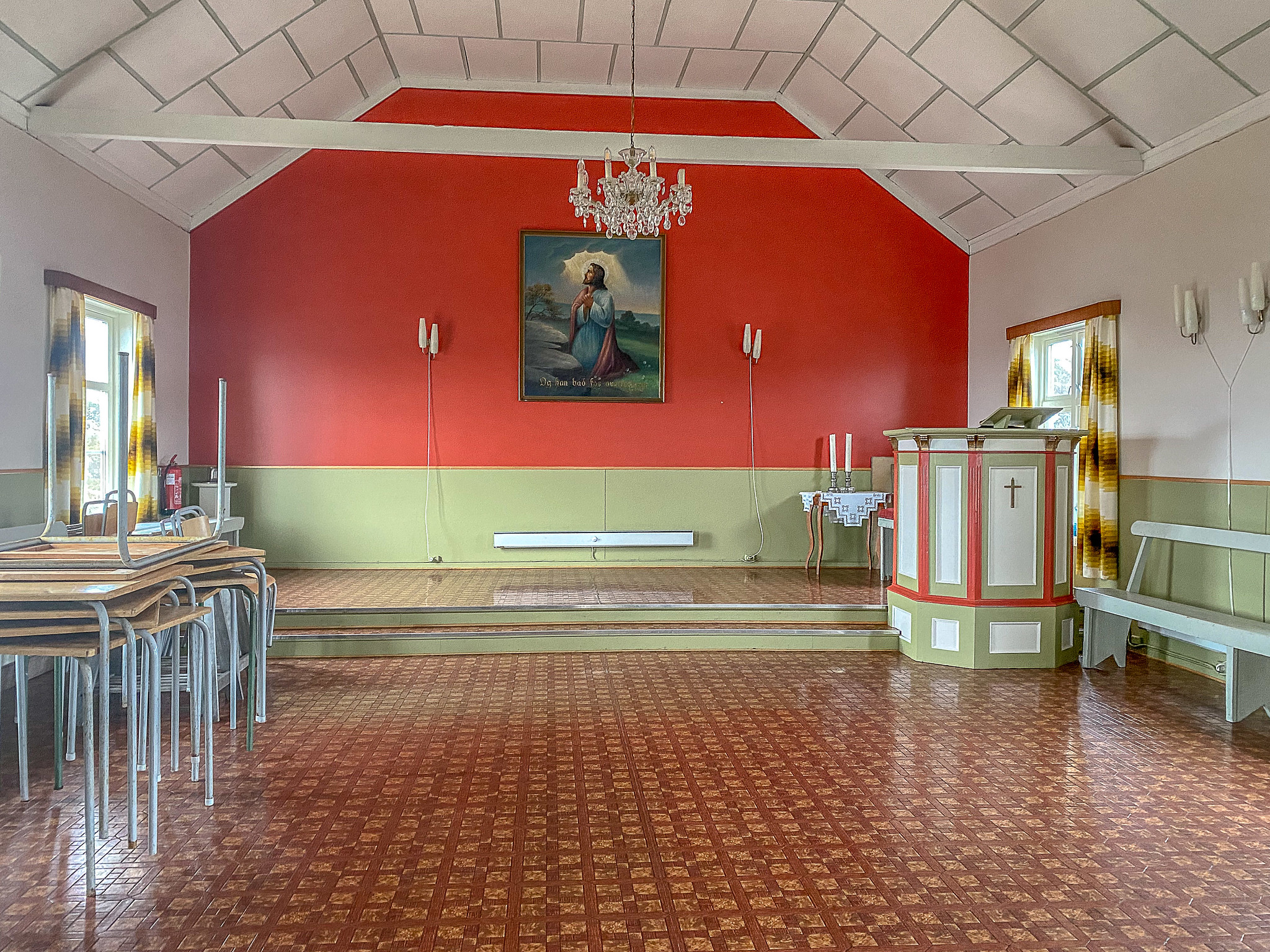 Vi fikk en privat omvisning i Forsamlingshuset. Visstnok bygget på inntekter fra en lensmann som i sin tid ivrig utstedte forelegg i øst og vest for små forseelser, fyll og bannsnakk. Pengene gikk ikke til statskassen, men til byggingen av forsamlingshuset.