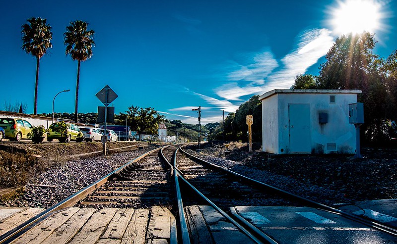 Vår Los Angeles har to lysregulerte fotgjengeroverganger, jeg får rødt på det andre, bare for å slippe over enda flere minihekser og det jeg mener å huske var en mini Spiderman i samme følget. Det er samlet en hel gjeng utkledde barn og foreldre inne på stasjonsområdet til venstre, det er togstasjon her, faktisk mulig å ta toget helt til Madrid herfra.