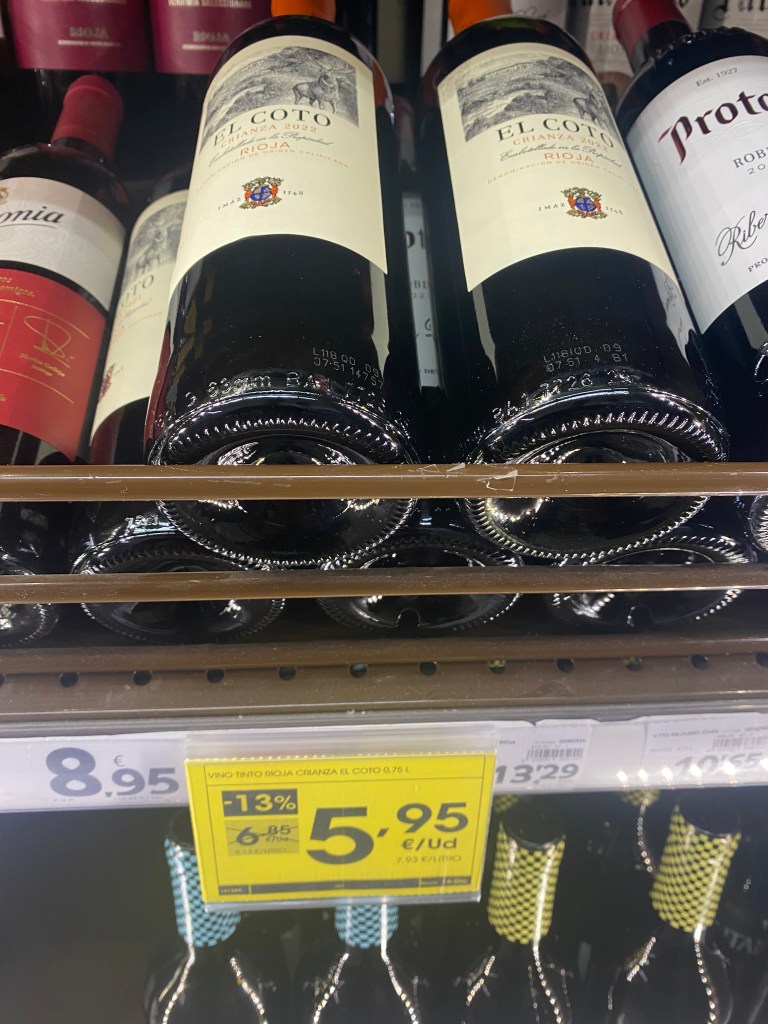 Ja, og i tillegg tilbud på vin hvis du kjøpte 2 flasker, jeg kjøpte fire, til den nette sum av ca. 150 kroner, blant annet to Campo Viejo, én flaske på polet koster ca. 140, det var den fjerdedelen igjen. Før jeg får satt meg i bilen står innehaveren igjen utenfor døren og gjenopptar praten med den samme gjengen, han fisker opp en ny sigg.