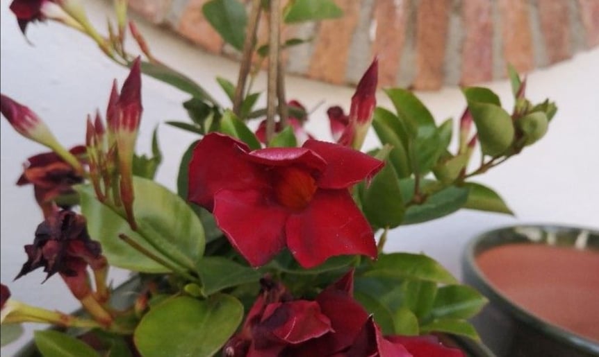 MANDY – er en brasilsk jasmin (mandevilla sanderi). Denne kjøpte Tore på Lidl i januar 2022 og selv om det sies at de ikke liker temperaturer under 16C – har den stått ute hele vinteren og har trivst og blomstret fra dag en.