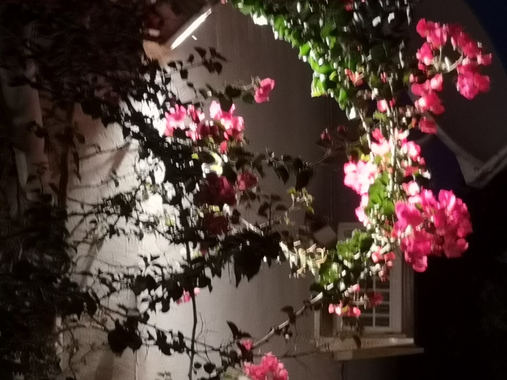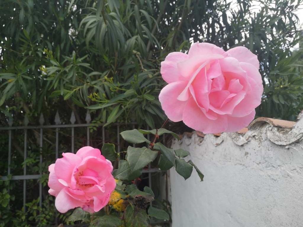 GUNNLAUG – Akkurat som den hvite rosen sto dissse to buskene her da vi kom hit. Jeg vet ikke hvilken sort det er, men har kalt den opp etter farmor Gunnlaug, fordi de ligner på rosene vi har etter henne i vår norske hage. Vi prøvde en gang å ta med en avlegger, men den tålte ikke varmen.