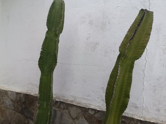 JAN & PETTER – Kandelaberkaktus, en variant blant slekten (Euphorbia candelabrum) jeg er ikke helt sikker. De blir kjempedigre og får noen fantastisk store hvite blomster. Disse vokste vilt utenfor det første huset vi leide i 2017 og Tore tok avleggere derfra. Det er også han som har gitt dem navn.