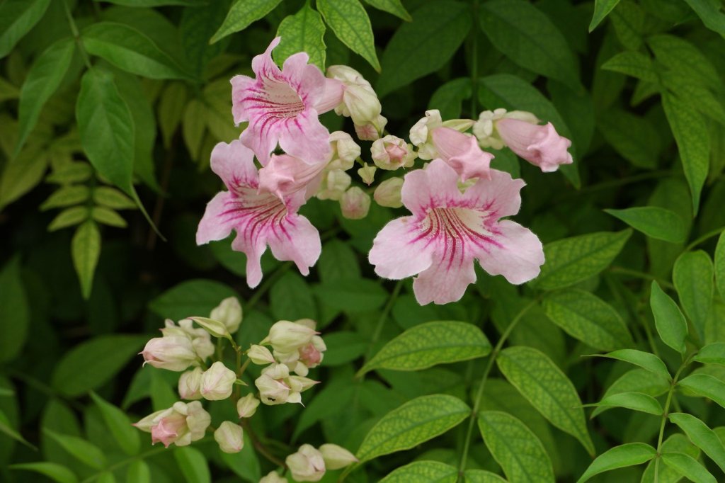 LAILA – rosa trumpetblomst (Podranea ricasoliana) har fått navn etter min skjønne mamma. Dette er en klatreplante som inntar hele veggen og pryder området ved inngangspartiet fra tidlig på våren til langt ut på høsten.