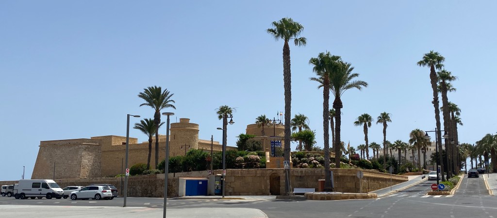 Men, ut og lufte oss må vi, uansett temperatur, det er da det er om å gjøre å finne steder som er skyggefulle eller luftige. Så underveis stoppet vl ved Castillo de Santa Ana, en festning som ligger på havnen i byen Roquetas de Mar. Her håpet vi på litt sval bris fra havet og kanskje muligheten for å kjøle oss ned inne bak murene.