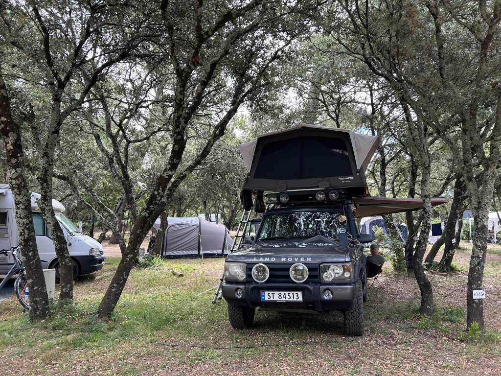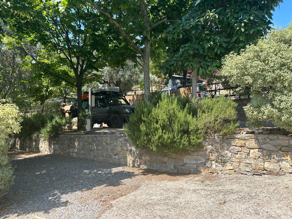 Det begynte å bli sent på kvelden for i Frankrike å være, så jeg dro opp alt jeg hadde av camping-apper for å se etter et privat sted vi eventuelt kunne få stå for natten. Vi befant oss helt nord ved innsjøen, og det eneste jeg fant som så ut til å kunne være åpent og ledig for innsjekking, var en gård langt inne i skogen i andre enden av innsjøen ved Bauduen, ca. 60 km unna. Vel, vi kunne ikke gjøre noe annet enn å prøve, i verste fall fricampe der inne i skogen uten lov.
