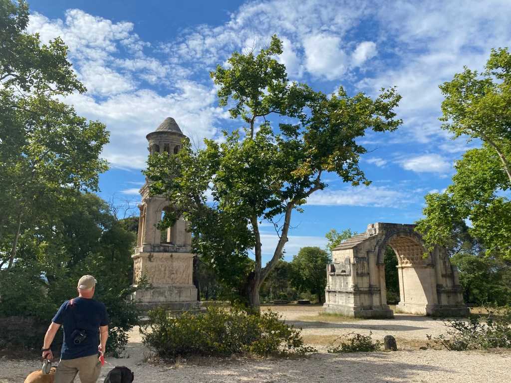 Vi dro videre til Glanum, eller rettere sagt ruinene av Glanum som var en antikk by like uten for dagens Saint-Rémy-de-Provence. Byen ble grunnlagt rundt 6. århundre fvt. av keltere, og senere okkupert av romerne. Glanum var kjent for sin imponerende arkitektur, inkludert templer, triumfbuer og termalbader. Den var et viktig kulturelt og religiøst sentrum i regionen før den ble ødelagt i det 3. århundre evt. I dag kan besøkende vandre blant ruinene og få et glimt av det romerske livet i Provence. Men, det fikk ikke vi og derfor har jeg ikke laget noen artikkel eller har flere bilder fra dette stedet. Det var nemlig ikke lov til å ta med hunder inn i selve byen, så siden det som alltid på denne turen ble for varmt i bilen, ble turen begrenset til det som står igjen byen på utsiden av det inngjerdete området.