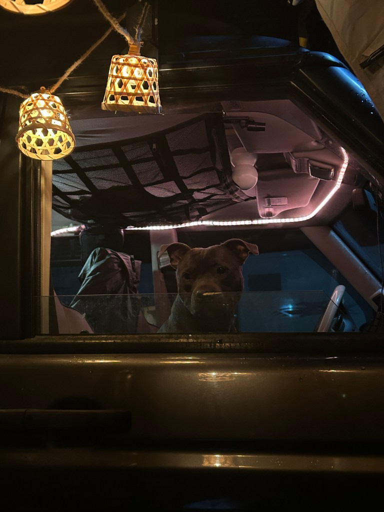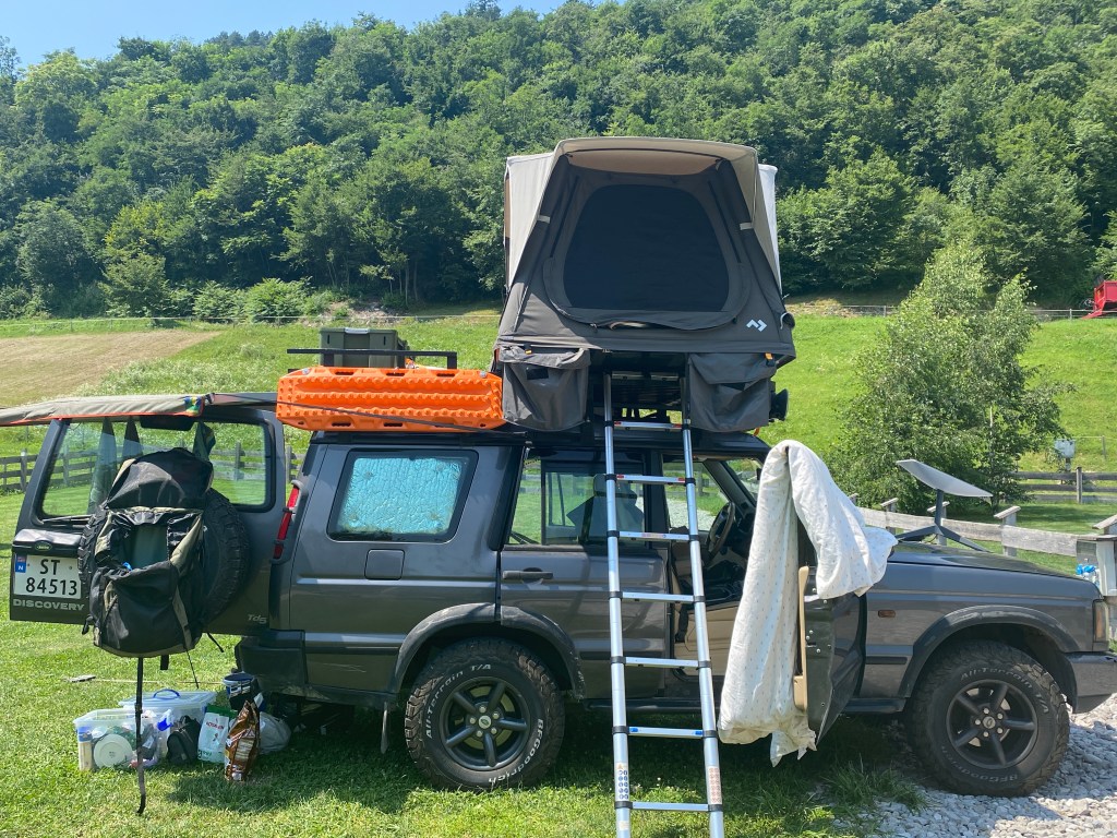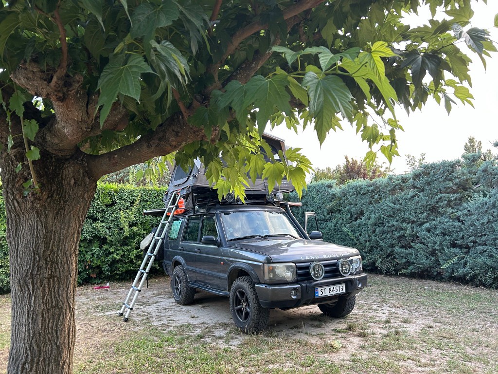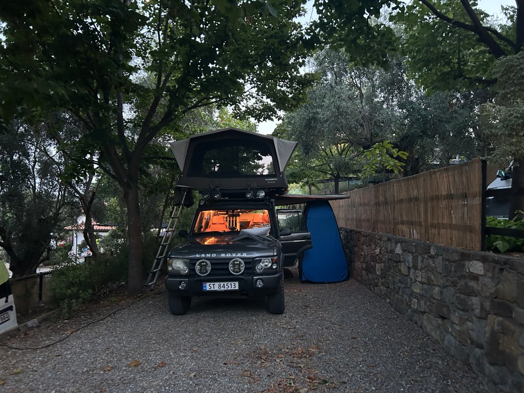 Vi sitter ute i teltet og hundene får hele plassen i bilen mens det regner og tordner. Vi har det alle godt og varmt. Vi har det ganske koselig egentlig og er bare glade for at vi slapp å stå i snøslette og storm oppe i Pardoipasset. Det er 250 meter til grensen til Østerrike, så da blir det i hvert fall ett, om ikke flere nye land i morgen.