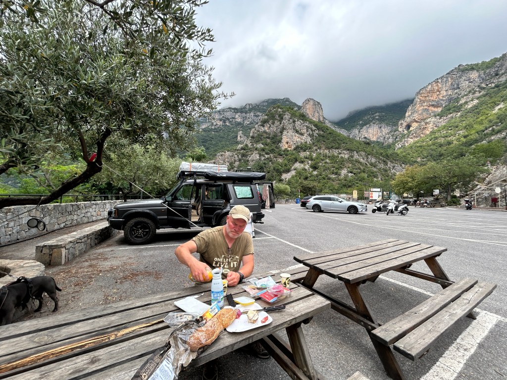 Så gikk turen videre østover, litt oppe i høyden, med god utsikt over den italienske rivieraen. Etter en god times kjøring var det på tide med litt lunsj, Så vi stoppet ved Grotte di Toirano, et imponerende underjordisk hulekompleks som er åpent for publikum.