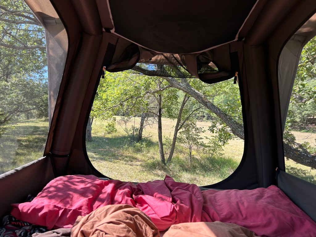 Takteltet er helt herlig… det har god madrass, vi har dyner og puter, det er som å være på tur med dobbeltsengen hjemme. Det er tykke vegger, ikke noe som minner om telt, og du kan åpne alt når du har lyst til å sitte på taket å betrakte omgivelsene.