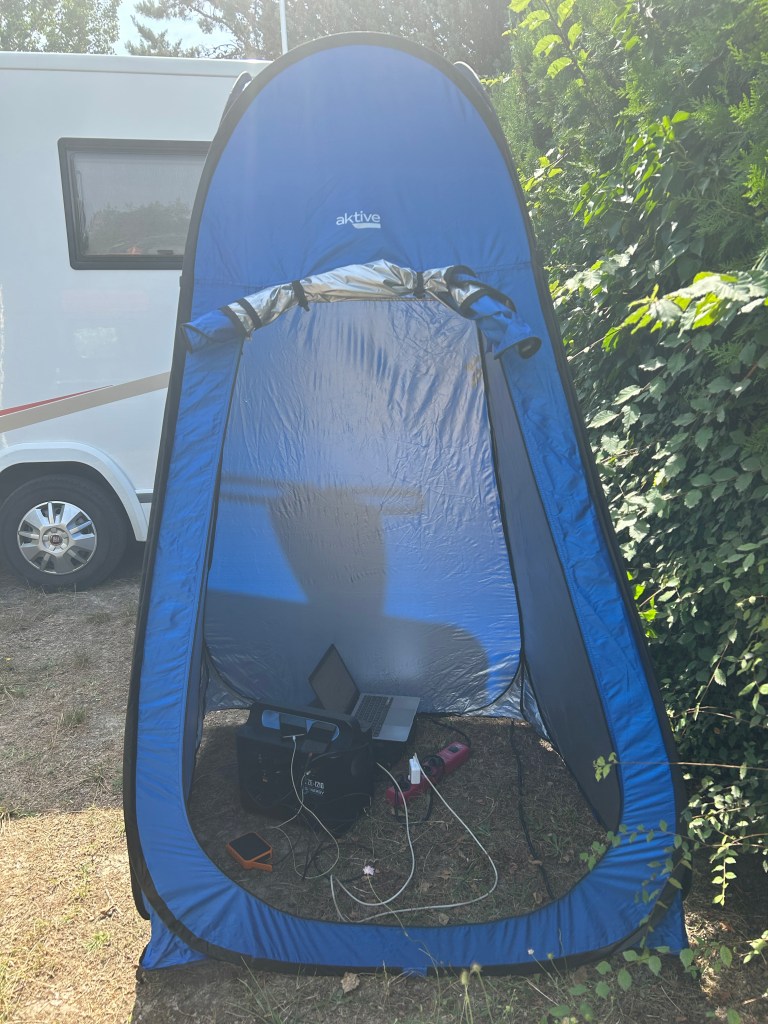 Siden strømkabelen ikke rakk helt frem og vi selvfølgelig ikke kunne sette utstyret ut i solen, ble løsningen å benytte dusjteltet som ladestasjon.
