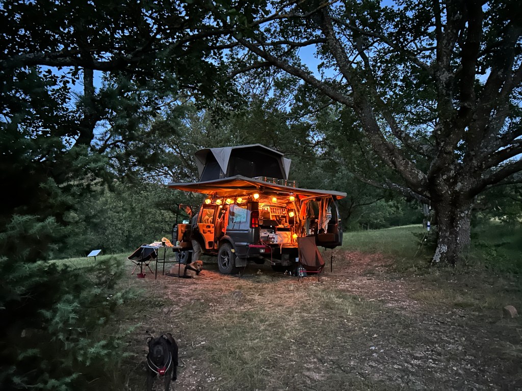 Vi installerer oss for kvelden i et helt eget skogholt. Det er et lite servicebygg på andre siden av jordet om vi trenger det, men vi er selvhjulpne med strøm og alt vi kan ønske oss. Et drømmested for hundene.