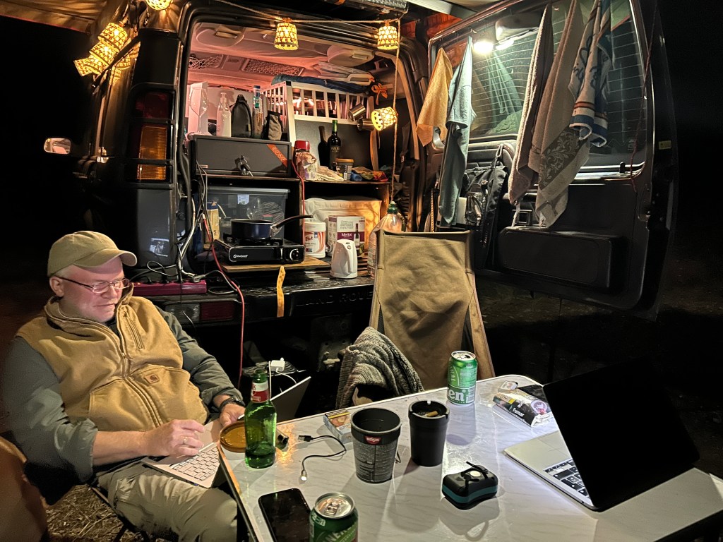 Vi vet jo aldri når vi finner et sted vi kan koble oss til strøm, så for å være rustet til noen dager med fricamping ville vi lade opp PCer, mobiltelefoner og ikke minst kraftstasjonen som forsyner kjøleskapet og gir oss 220V til andre ting.