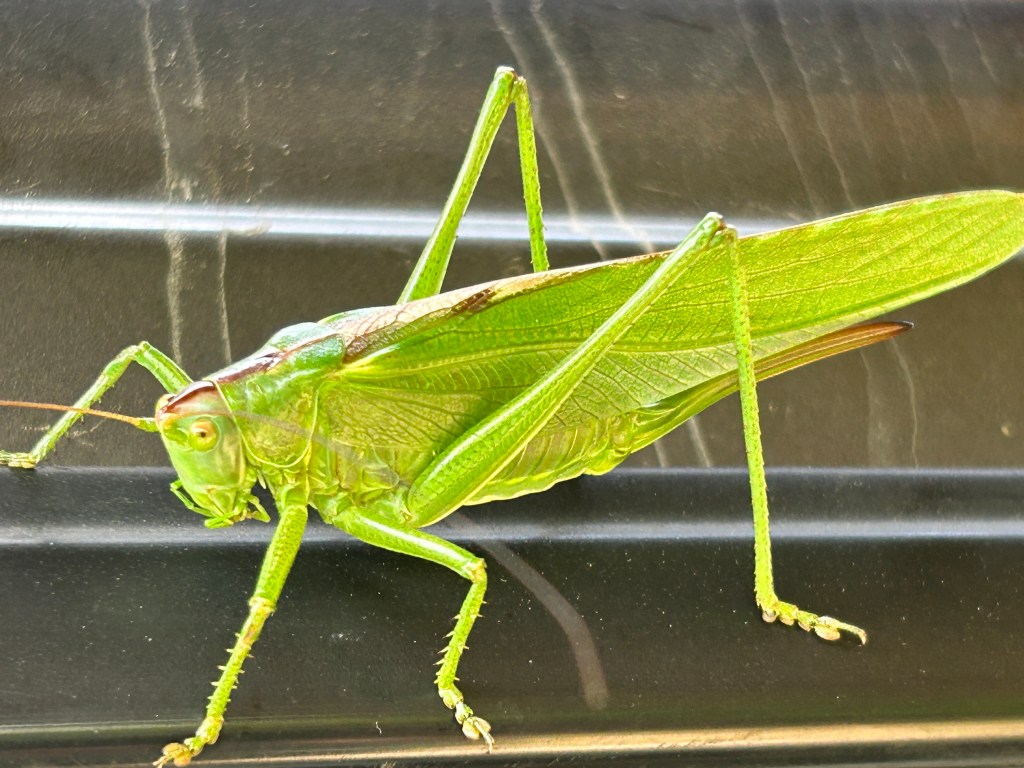En fargerik blindpassasjer (Løvgresshoppe) var lite villig til å forlate bilen da vi skulle dra. Den ble omsider etter litt krangel, skånsomt overtalt. De kan være aggresive, de er kjøttetende og kan bite kraftig om de føler seg truet. De finnes faktisk i Norge også, spesielt rundt Oslofjorden.