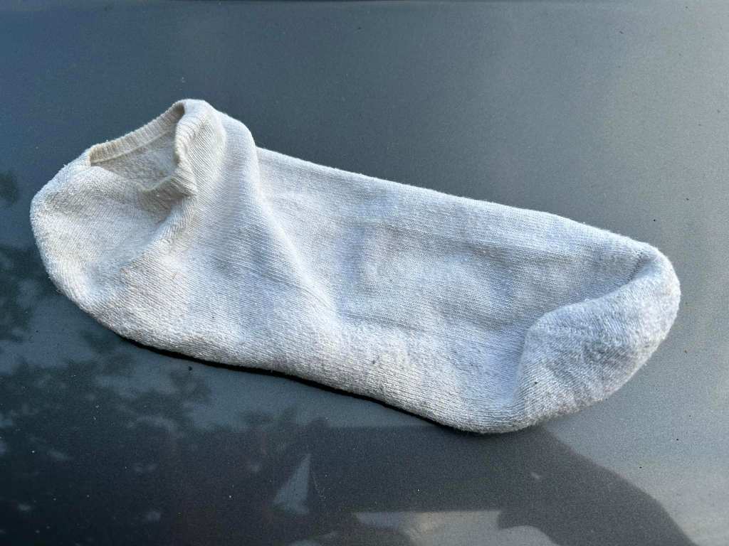 Sokken var større en mine, dessuten var den våt. Så konklusjonen ble at den tilhørte noen som hadde vært å badet i elven, lagt sokkene på bilen og glemt dem. Sånn er det altså alle disse sokkene havner på veien.