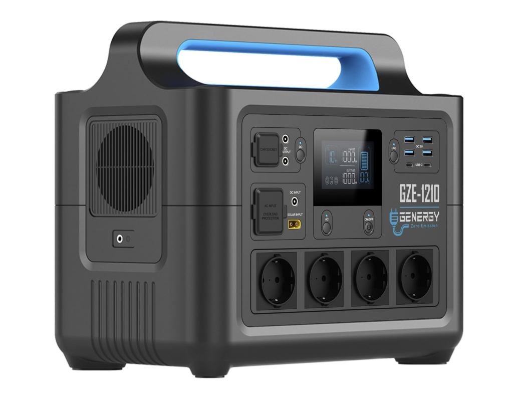 Kraftstasjonen forsyner oss med strøm når vi camper. Den har kapasitet på 1228 wattimer, har 2 x USB/2 x USB-C uttak, 4 x 220V (max 1000 w) og 1 x 12V uttak og lades når vi kjører via 12V.