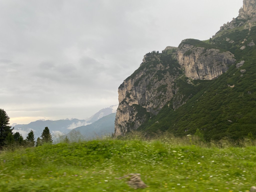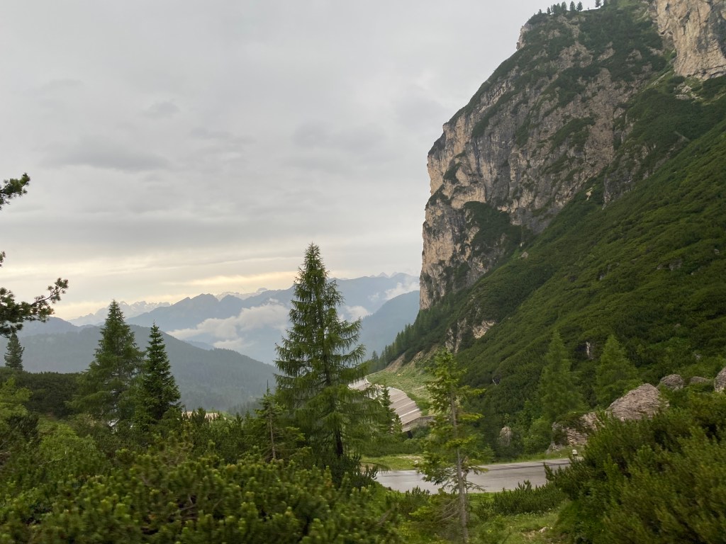 Etter hvert som vi tråklet oss inn igjennom dalene i Dolomittene på ca. 1 400 meters høyde ble det stadig mer skyer og vi kunne bare så vidt skimte de dramatiske toppene gjennom skyene. Utsikten vi hadde gledet oss til var skjult bak tåke. Men, nå var vi her og bestemte oss likevel for å kjøre det berømte Pordoipasset som er en av de høyeste fjellovergangene i Dolomittene på 2 239 meter over havet og fortsatt med fjelltopper nesten så høye som Galdhøpiggen over der igjen.