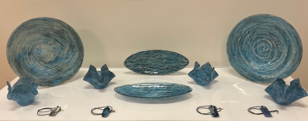 Serien «Hav og Kyst», er farget med koboltoksid, blåfargen representerer havet, og den spesielle teknikken er helt unik, prosessen gir bobler og detaljer i glasset, som minner litt om bølgene som evig slår mot land…